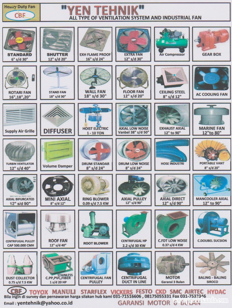 YEN TEHNIK yang bergerak di bidang Ventilasi fan dan Industri Fan , Ducting fan ,  Hoist , Air Compressor , motor electric , hydraulic And Pneumatic .